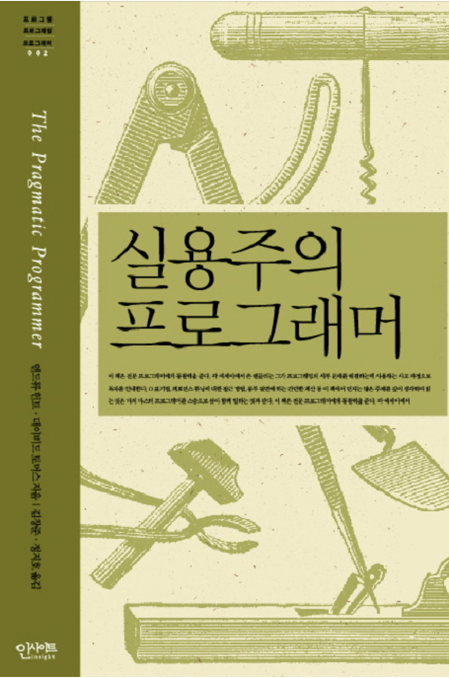 "실용주의 프로그래머"를 읽으며 오랜 경력을 자랑하는 소프트웨어 장인에게 가르침을 받는 듯한 느낌을 받았다. 이 책에는 최신 소프트웨어 트렌드나 언어, 개발 툴 같은 이야기는 없다. 하지만 그 모든 것들을 관통하는 소프트웨어 엔지니어링의 철학과 개발자가 가져야 할 자세 등을 다룬다. 개발자가 더 훌륭한 개발자가 되도록 안내해주는 탈무드 같은 책이다.